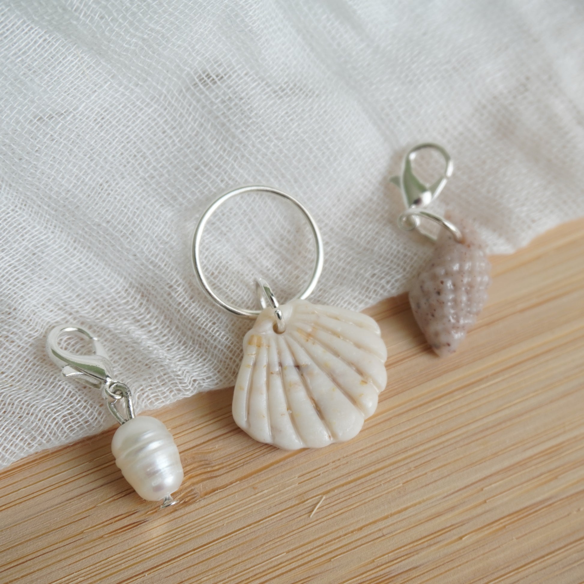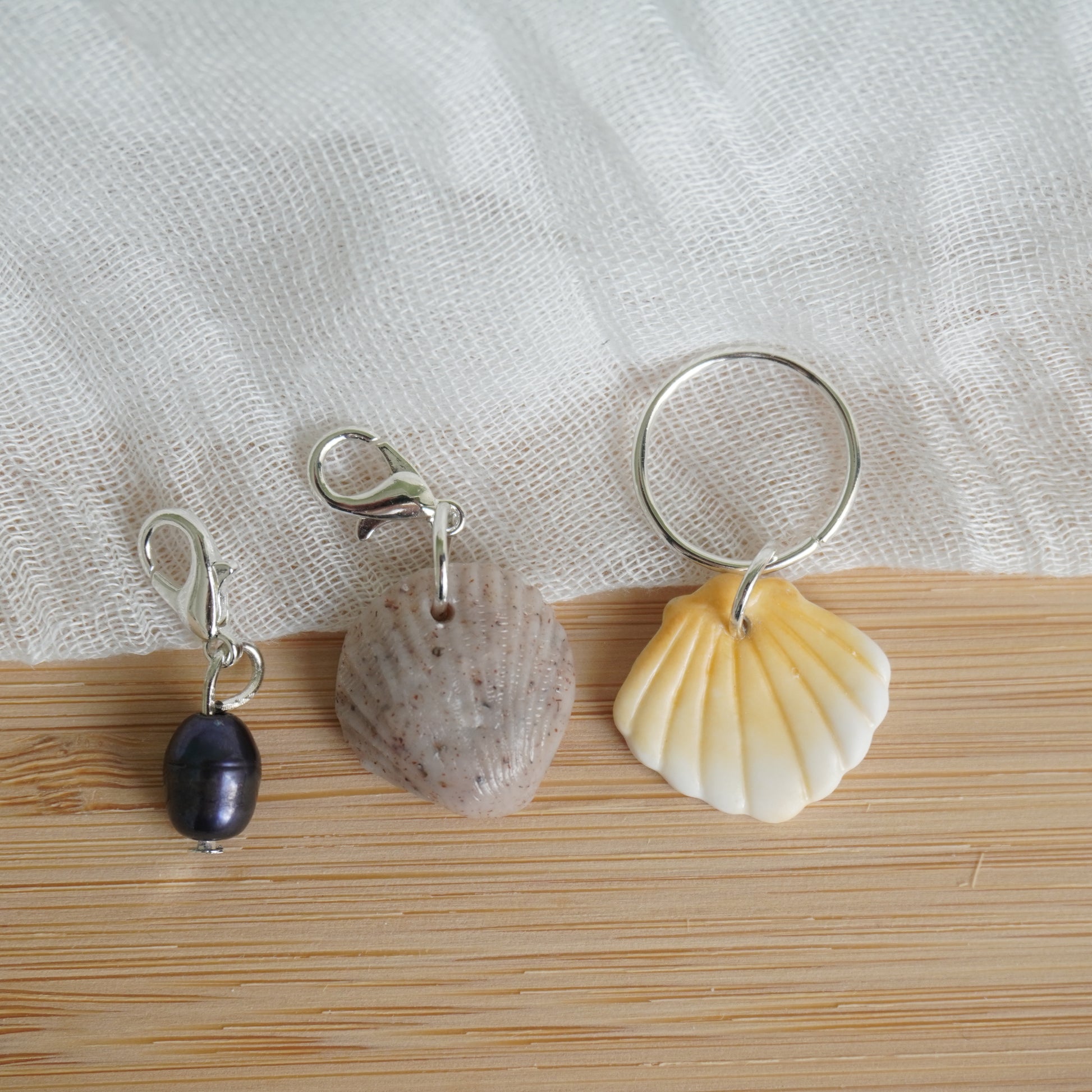 Ein Set handgemachter Maschenmarkierer aus Modelliermasse passend zum Thema Muscheln. Kombiniere 3 Maschenmarkierer und spare dabei!