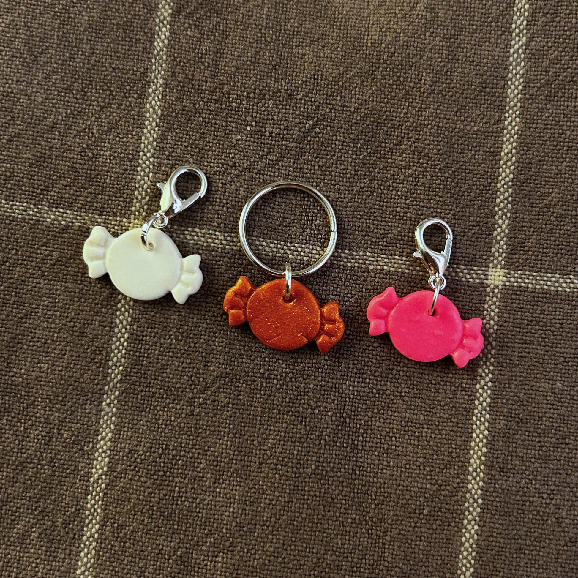Ein Set handgemachter Maschenmarkierer aus Modelliermasse passend zum Thema Süßes oder Saures. Kombiniere 3 Maschenmarkierer und spare dabei!